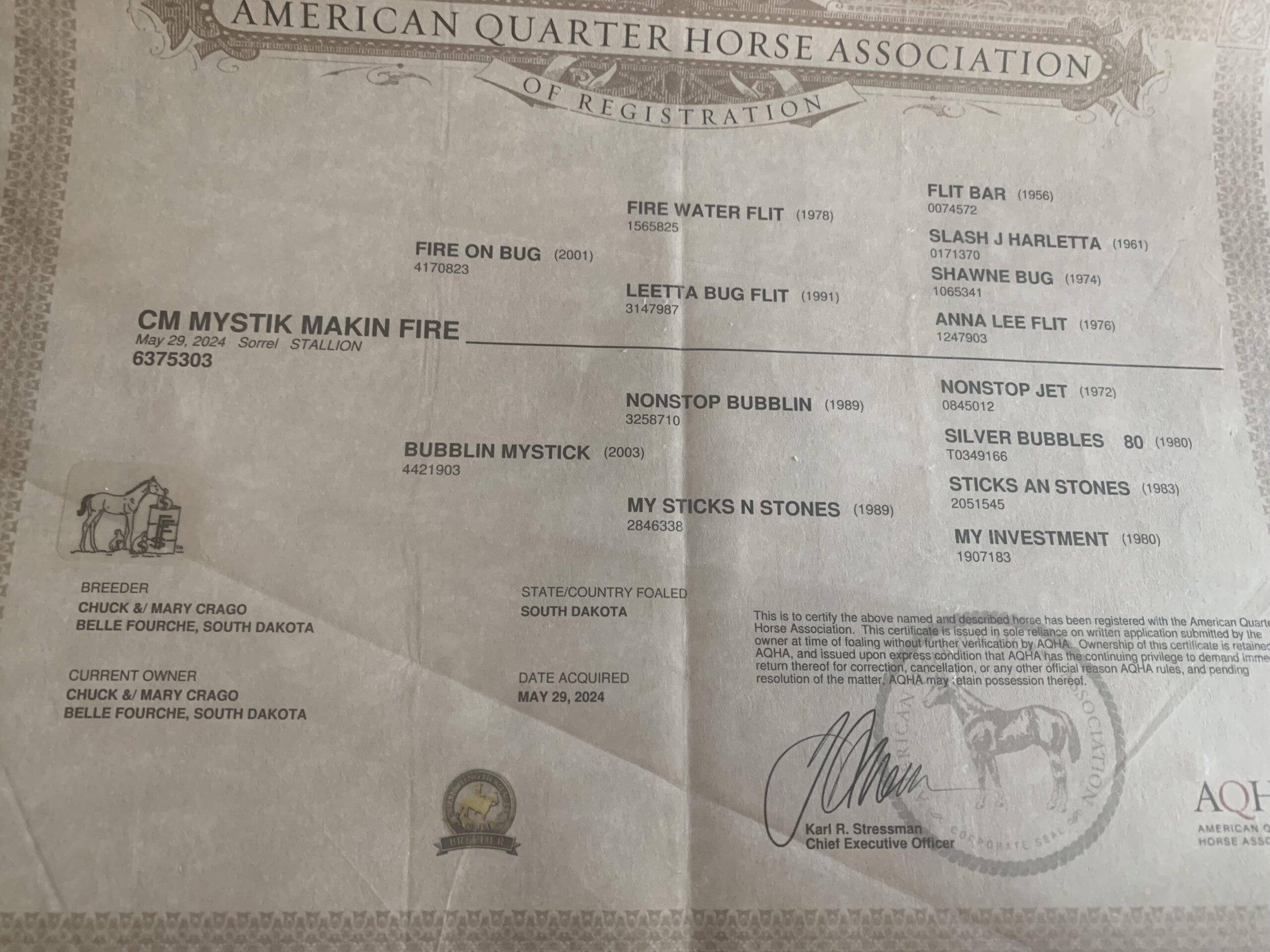 Full-sister to Greg Olsen Memorial Derby ChampionCM STONEY BUBBLES ($40,000+), half-sister to AQHA Open Superior Barrel Horse IM A SLICK STICKsi 82 (132.5 AQHA Points), ONE STICKS N STONES si 89 ($10,989), etc.